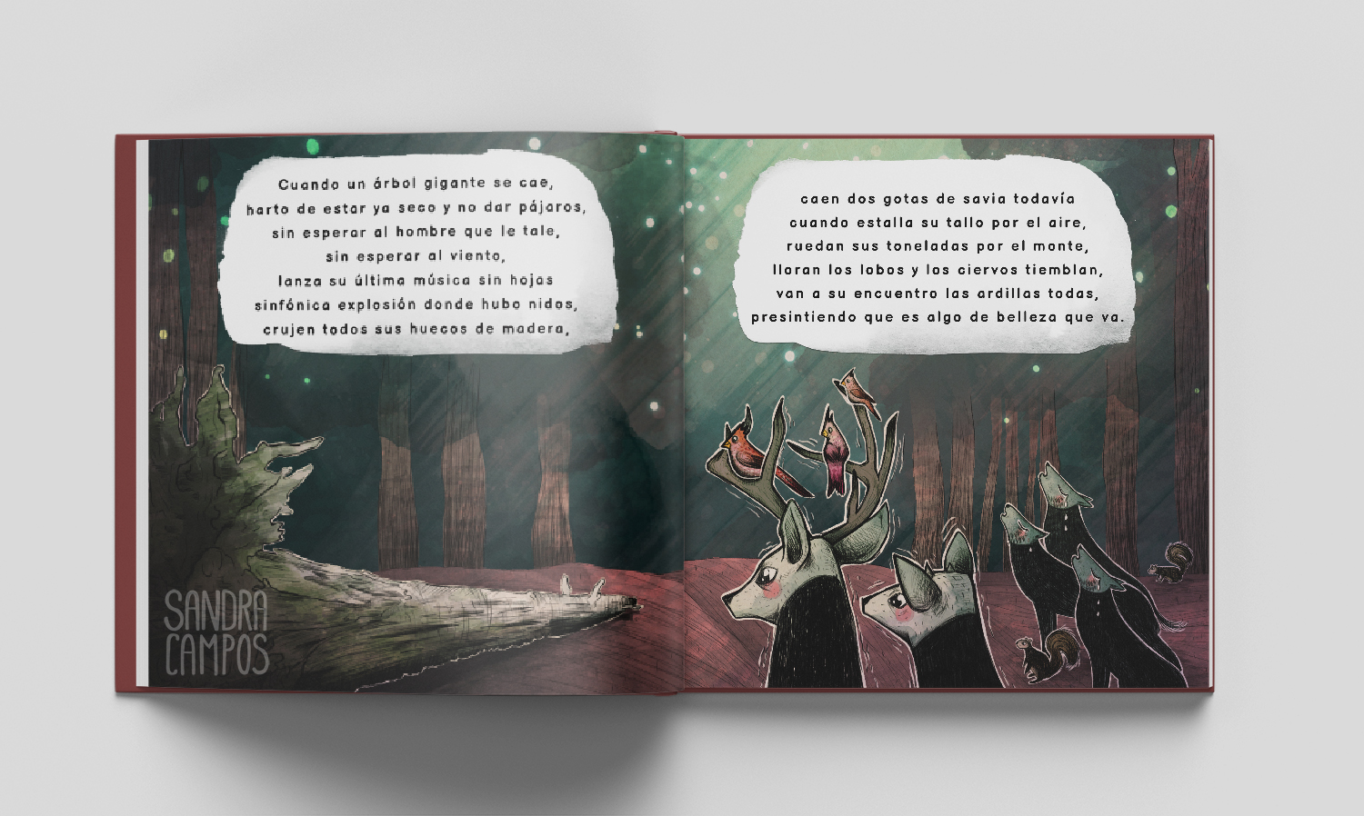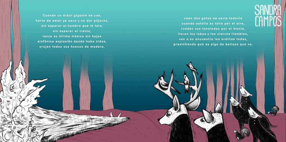 Make a double page of a children’s illustrated album called “In the woods of Pennsylvania”, by Gloria Fuertes. The format, colors and technique are free.